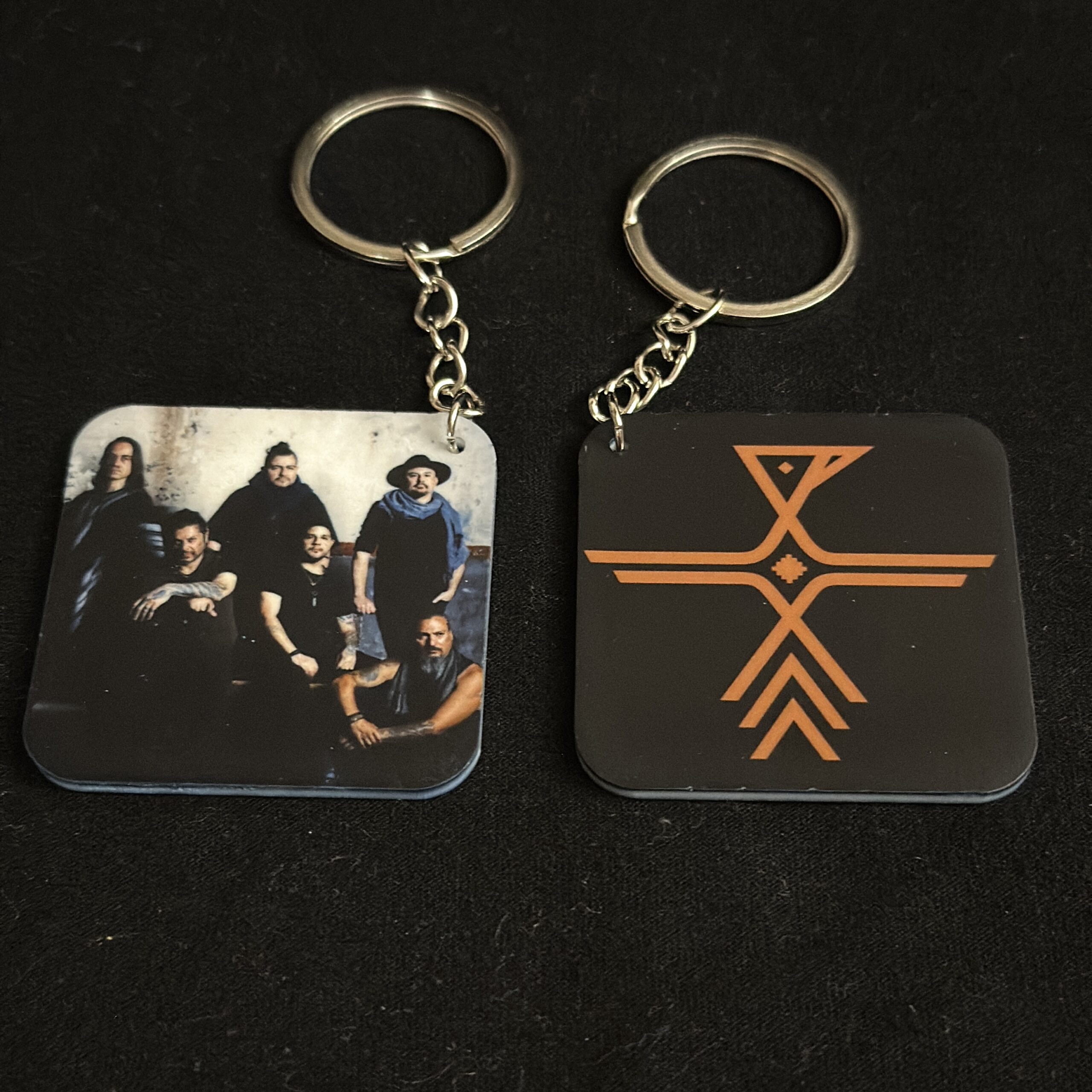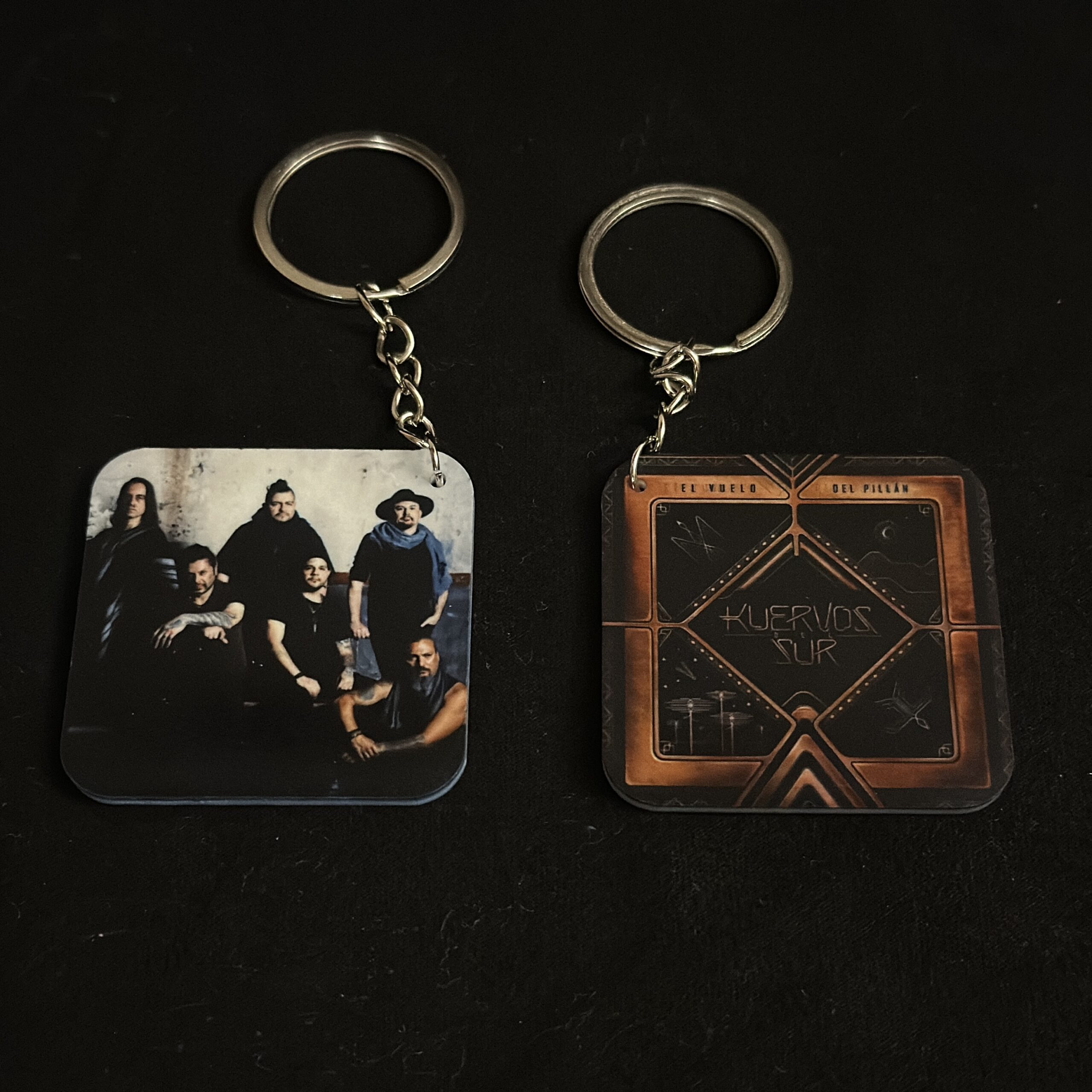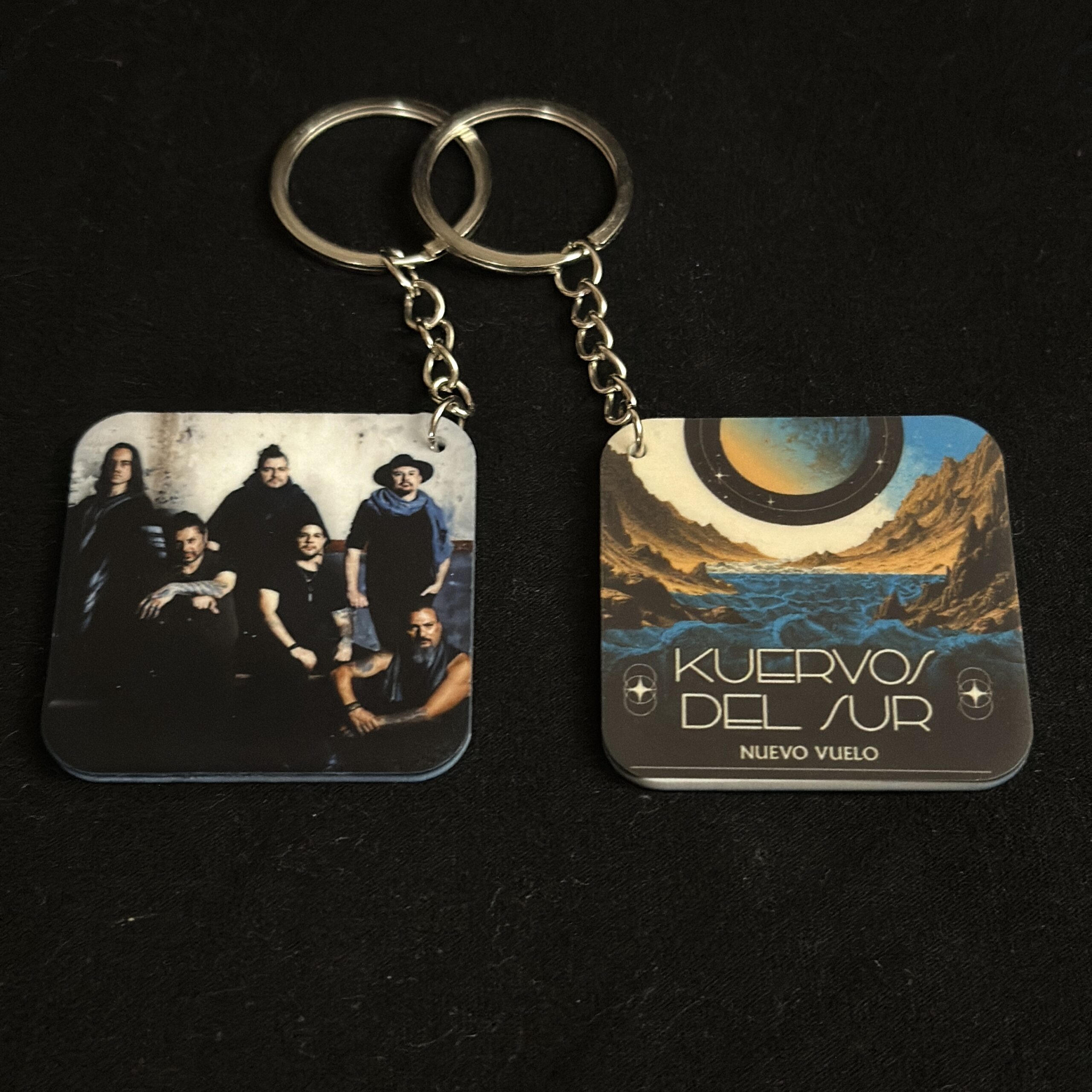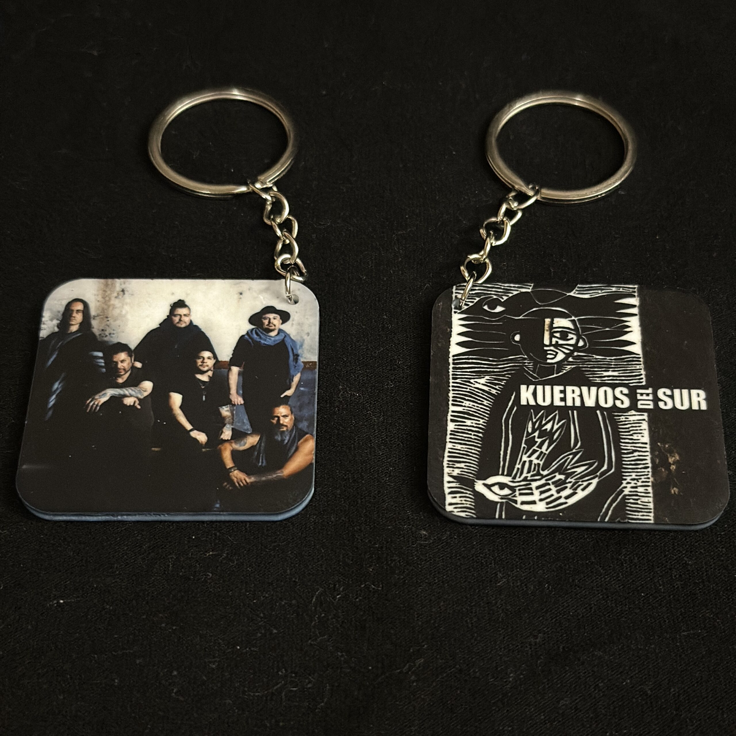 Llavero de plástico duro impreso por ambos lados, en un lado la imagen de la banda, en el otro variados diseños.